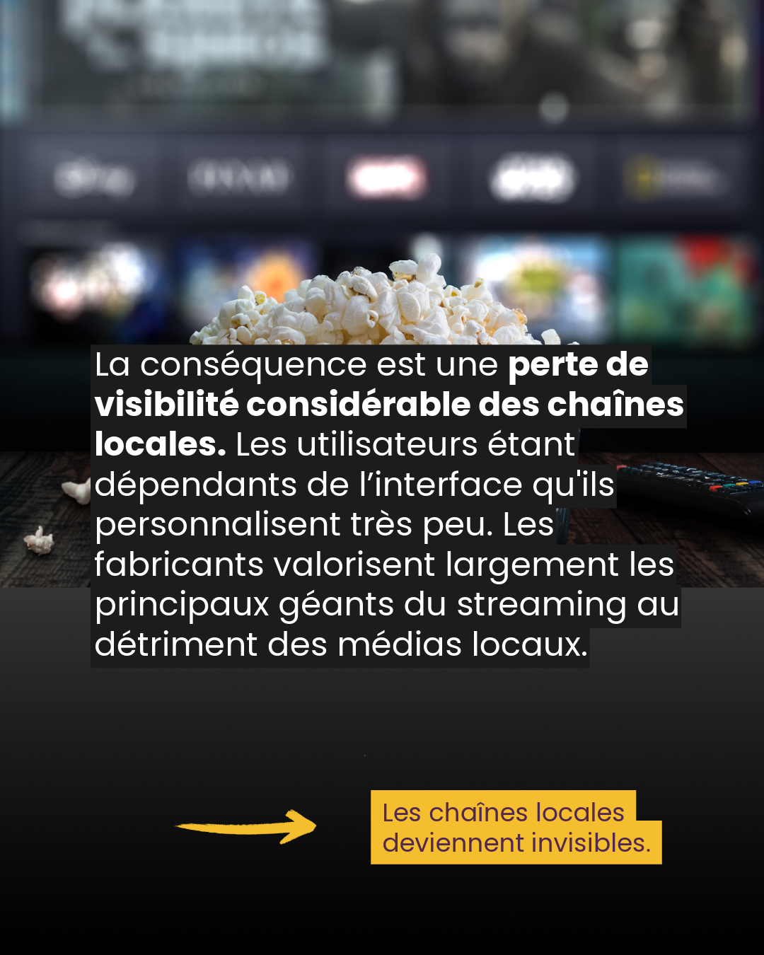L’interface choisie par les fabricants a donc un impact important sur le choix final du consommateur. Les chaînes locales subissent dès lors une perte de visibilité conséquente dans les configurations initialement définies par les fabricants des téléviseurs connectés.