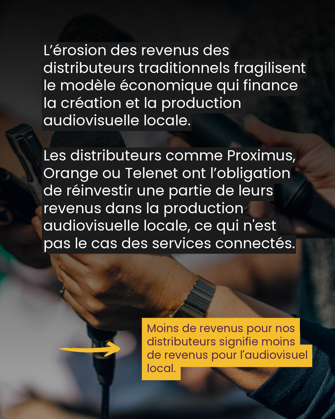 L’érosion des revenus des distributeurs traditionnels et la captation de valeur par les intermédiaires fragilisent le modèle économique qui finance la création et la production audiovisuelle locale. Les distributeurs comme Proximus, Orange ou Telenet ont l’obligation de réinvestir une partie de leurs revenus dans la production audiovisuelle locale. Ils représentent même les plus gros contributeurs de cette obligation, largement devant les chaînes télévisuelles ou de streaming soumis à cette même obligation. Les téléviseurs connectés ne sont actuellement pas soumis à ce type d’obligation.