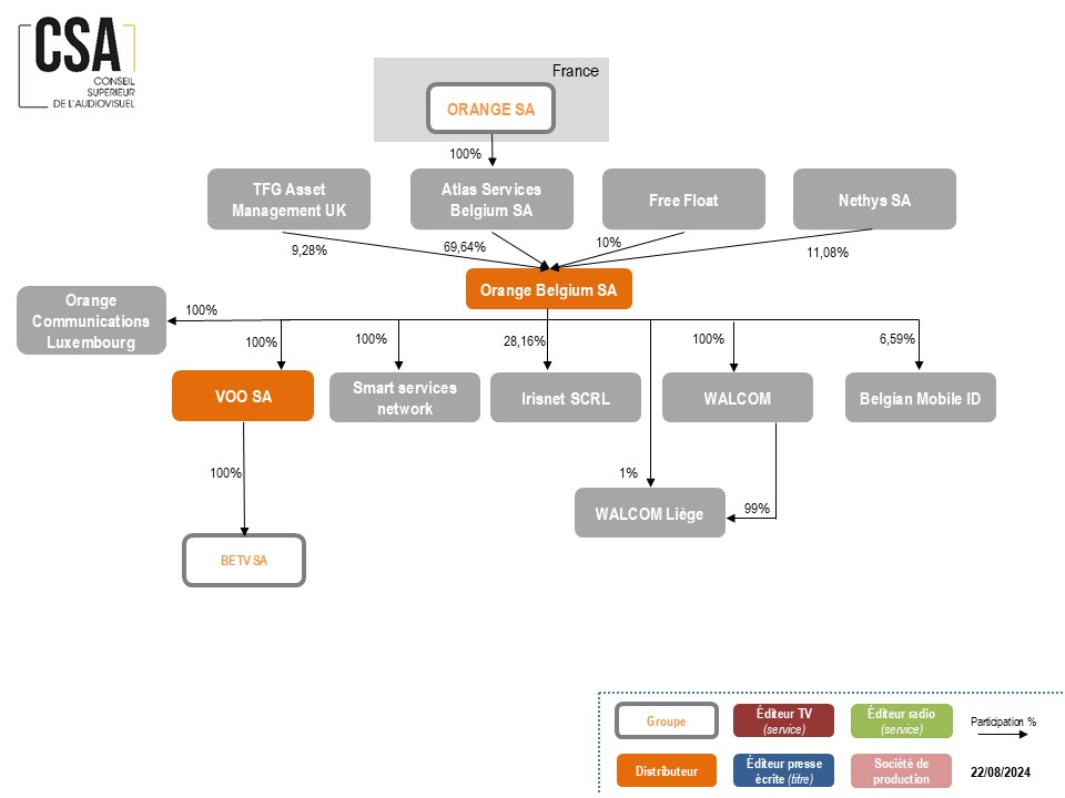 BeTV SA qui édite Be 1, Be 1 +1h, Be 1 Home of HBO, Be Ciné, Be Séries, Be TV à la demande, Divertissez-VOO, My X-Pass, VOO Sport World 1, VOO Sport World 2, et VOO Sport World 3 fait partie du Groupe Orange